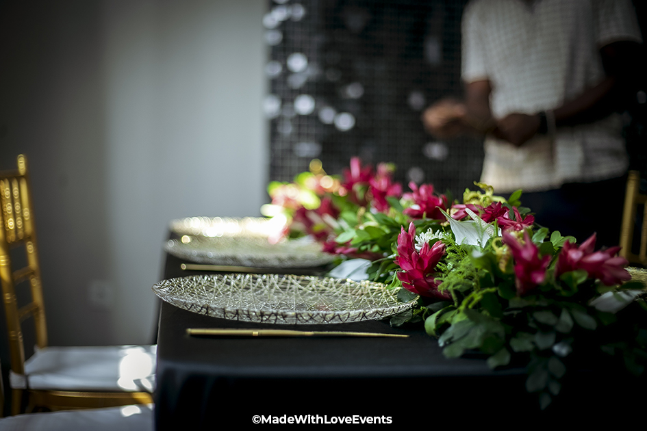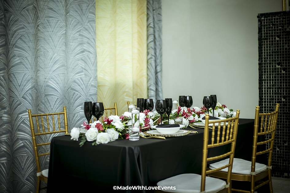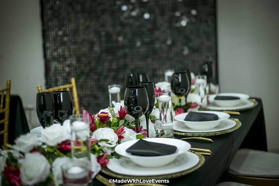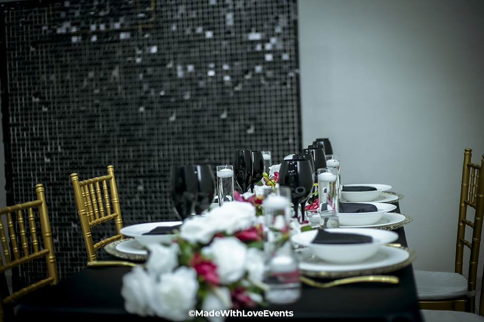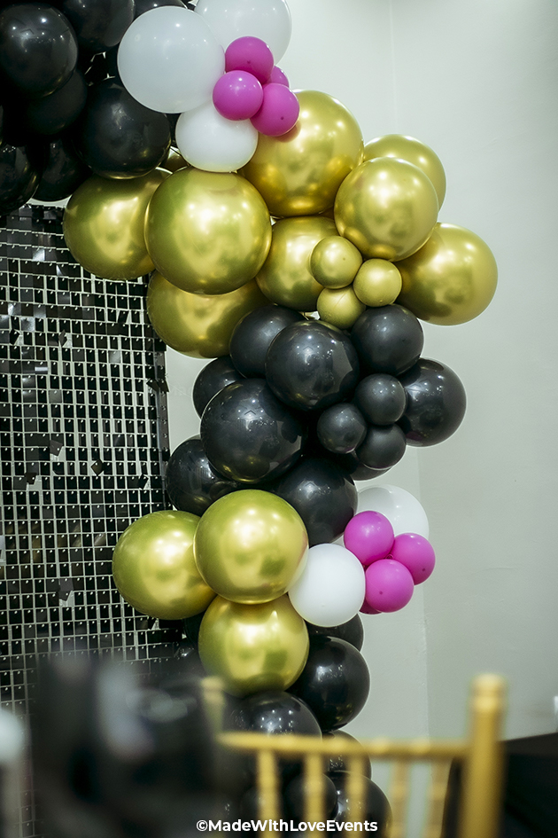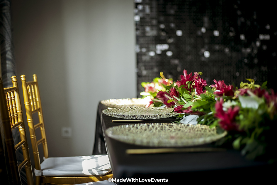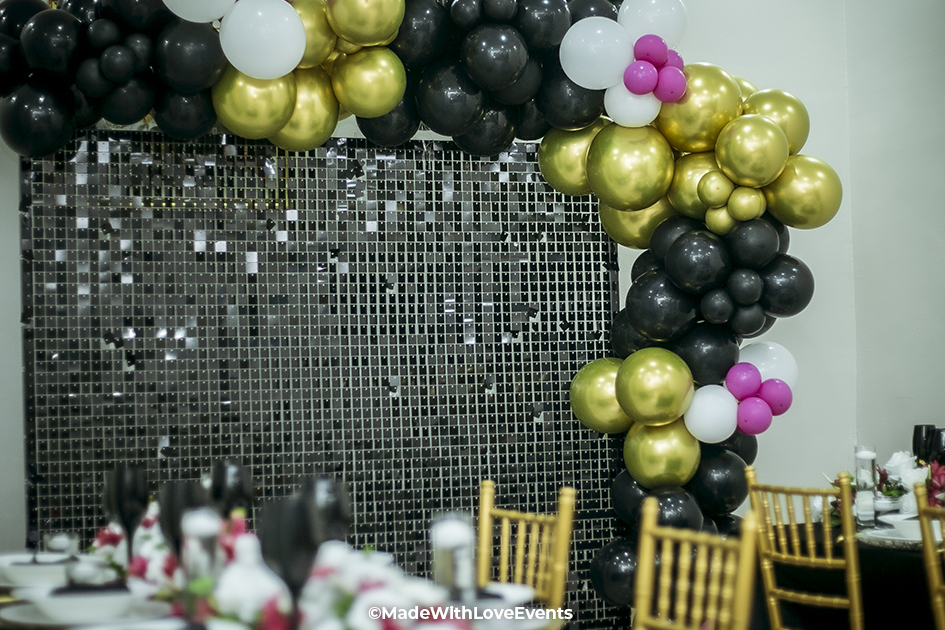 Le noir et l'or se marient magnifiquement bien ! Modernes et très chic, ces deux couleurs s'accordent à la perfection permettant de realiser une décoration glamour pour un anniversaire. Effet glamour recherche et accentue par les rideaux lumineux pour le 16 eme anniversaire de Kiyane.