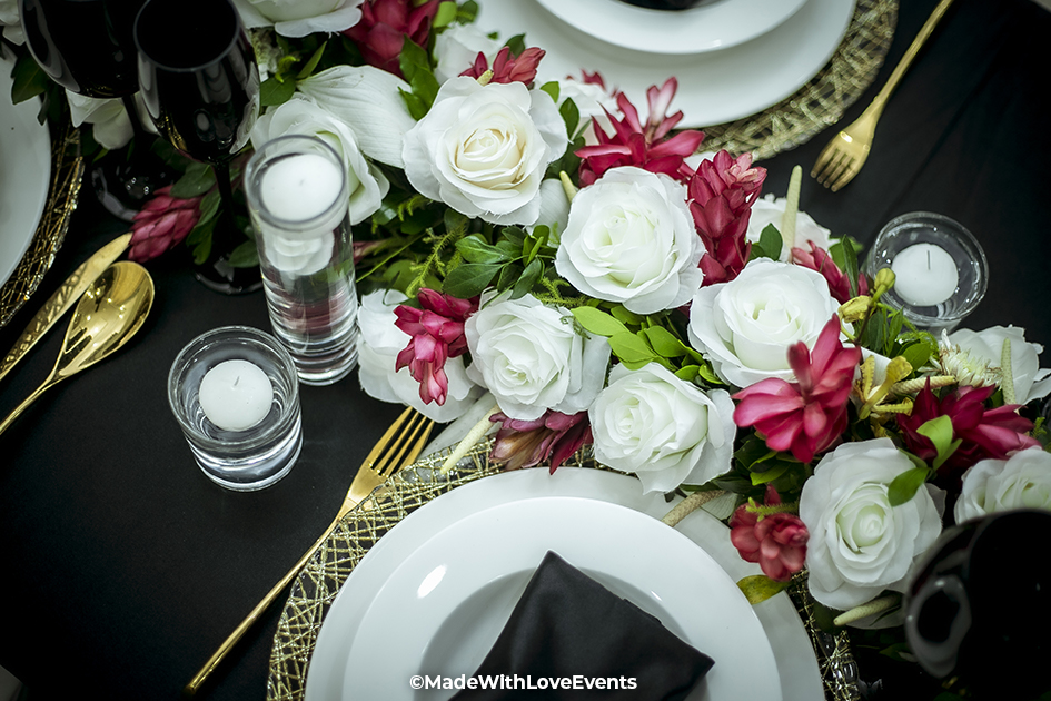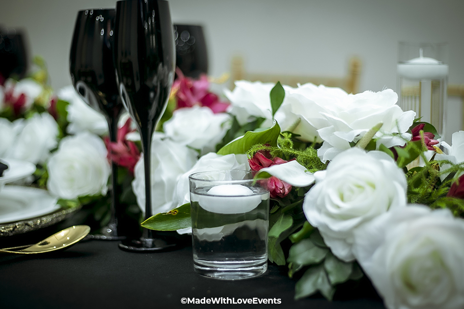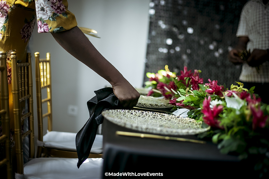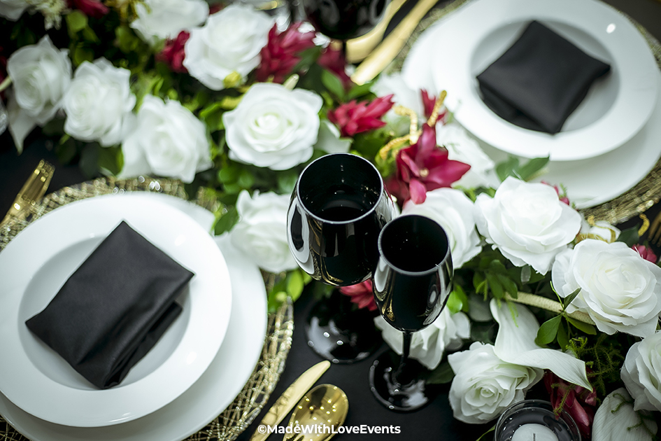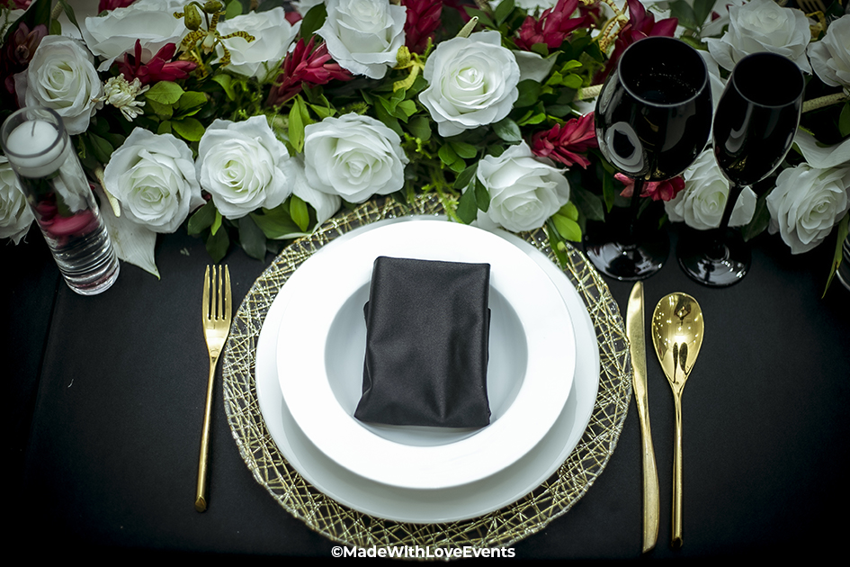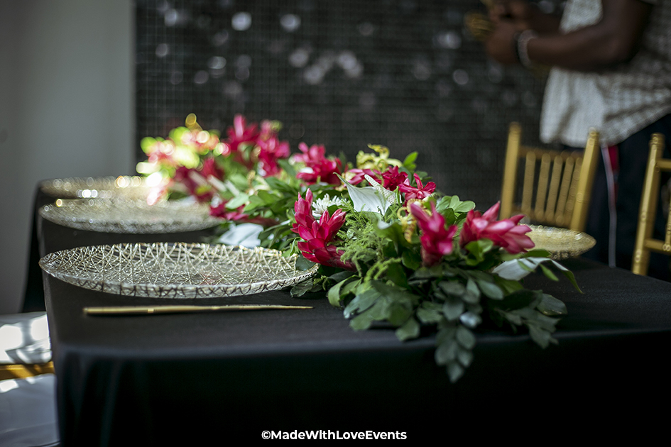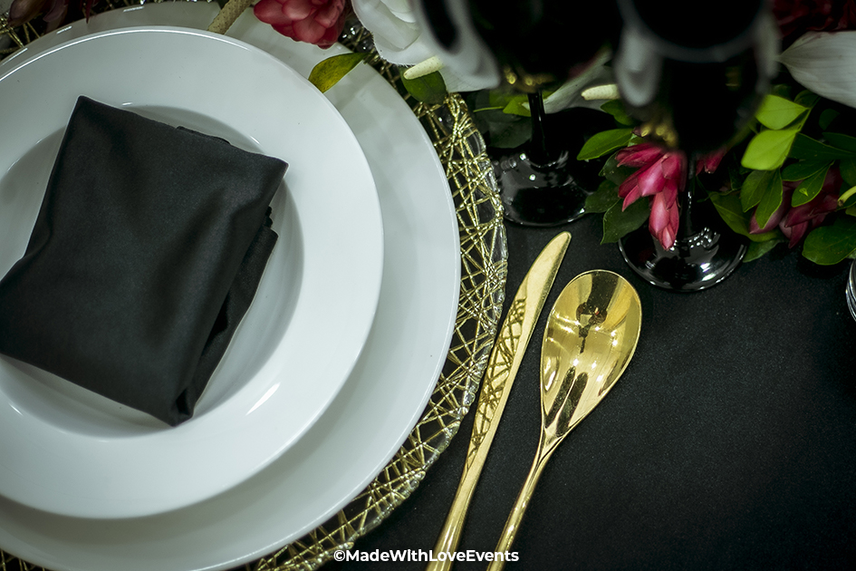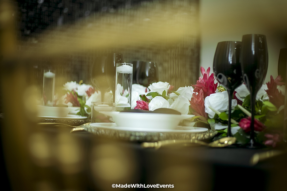 Le noir et l'or se marient magnifiquement bien ! Modernes et très chic, ces deux couleurs s'accordent à la perfection permettant de realiser une décoration glamour pour un anniversaire. Effet glamour recherche et accentue par les rideaux lumineux pour le 16 eme anniversaire de Kiyane.
